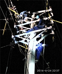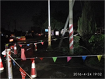 2016年4月24日下午4時,江門市突發(fā)暴雨天氣,下午6時突然接到緊急搶修通知——江門市蓬江區(qū)杜阮鎮(zhèn)子棉線龍安支線因路政管網(wǎng)施工,施工作業(yè)鉤機作業(yè)時損壞10kV子眠架空導線,導致大片居民用戶斷電,嚴重影響當?shù)鼐用竦纳睢?/span>