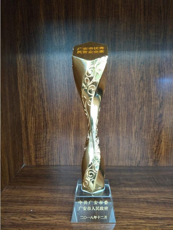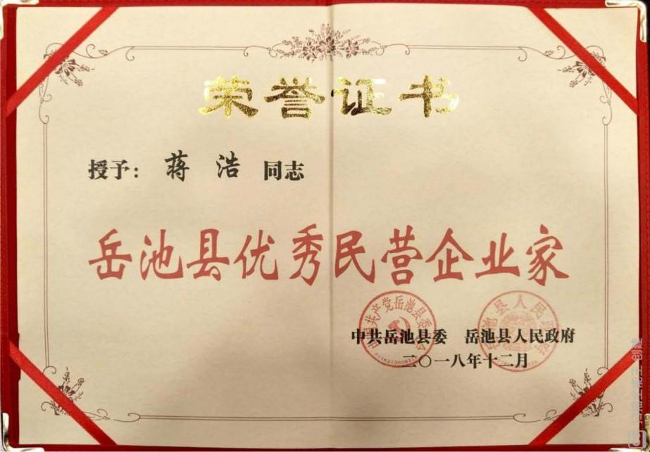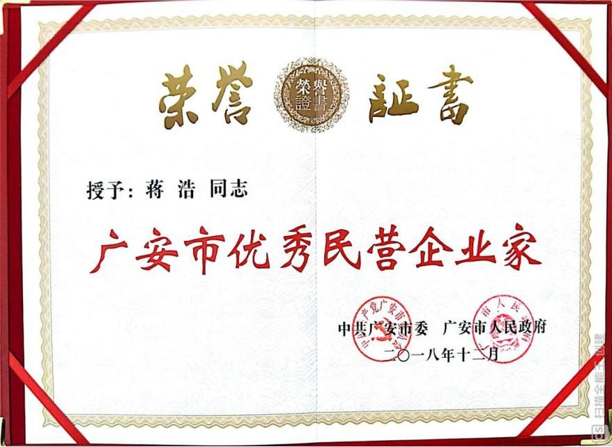 在中共廣安市委、廣安市人民政府及中共岳池縣委、縣政府及各級部門的大力支持和深切關(guān)愛下,我公司董事長蔣浩同志受邀參加了2018年“廣安市民營經(jīng)濟健康發(fā)展大會”及“岳池縣民營經(jīng)濟健康發(fā)展大會”,并獲得“廣安市優(yōu)秀民營企業(yè)家”、“岳池縣優(yōu)秀民營企業(yè)家”的榮譽稱號。